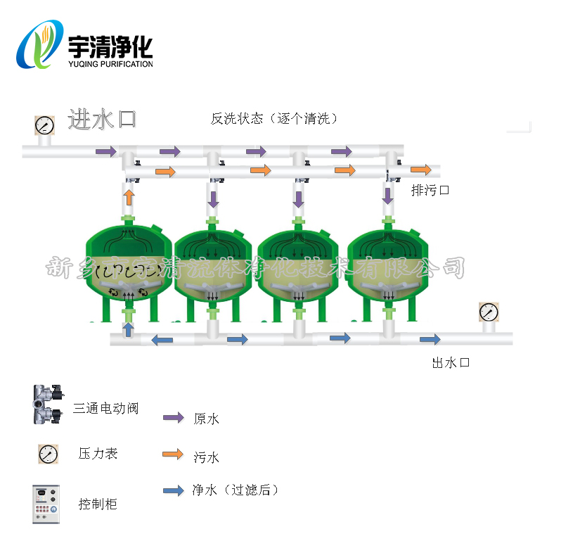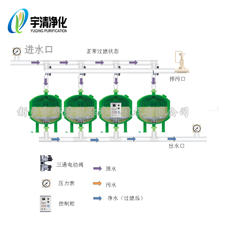 反洗狀態(tài): 淺層沙過濾器采用逐個反洗方式。過濾器接受指令開始反洗時,第一臺過濾沙缸開始清洗,其他過濾沙缸正常工作。首先第一臺過濾沙缸三通閥門開始準(zhǔn)備動作,關(guān)閉進(jìn)水通道,打開出水通道及排污通道。未過濾的水無法通過三通閥門進(jìn)入到過濾器中,而其他過濾器過濾后的水則可以反向進(jìn)入到一號過濾器中,將沙子沖洗,并且把雜質(zhì)經(jīng)過布水器從排污口排出,布水器可以保證沙子不會隨雜質(zhì)一起帶出,避免跑砂的情況發(fā)生。1號過濾單元清洗完成后,1號單元三通閥門開始動作,打開進(jìn)水及出水通道、關(guān)閉排污通道,水經(jīng)過過濾器正常過濾系統(tǒng)開始對2號進(jìn)行清洗,清洗步驟與1號清洗步驟一樣。直到所有過濾單元逐個清洗完成后,反洗結(jié)束,等待接受 下一個反洗指令,系統(tǒng)的設(shè)計可實現(xiàn)反洗時不停水,過濾、反洗狀態(tài)同時進(jìn)行保證整個系統(tǒng)的正常工作。