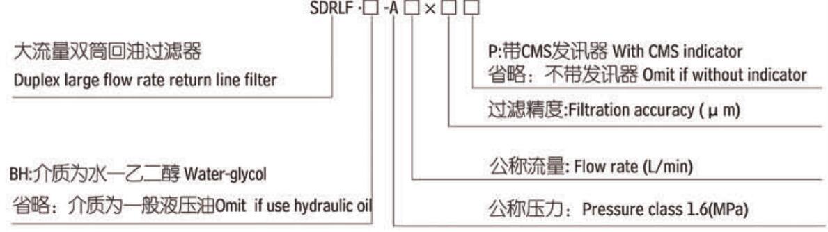 注:*為過濾精度 如過濾油液為一般液壓油,流量1300L/min、精度10微米,配置發(fā)訊器 型號為SDRLF-A1300*10P,濾芯型號為SFX-1300*10。