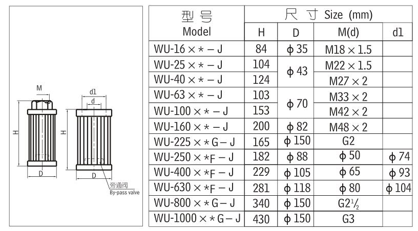 注:*為過濾精度 如流量63L/min、精度100微米,則型號為WU-63*100-J