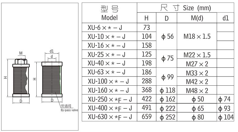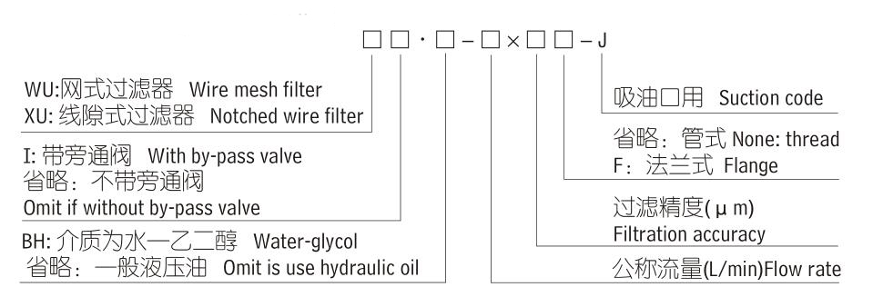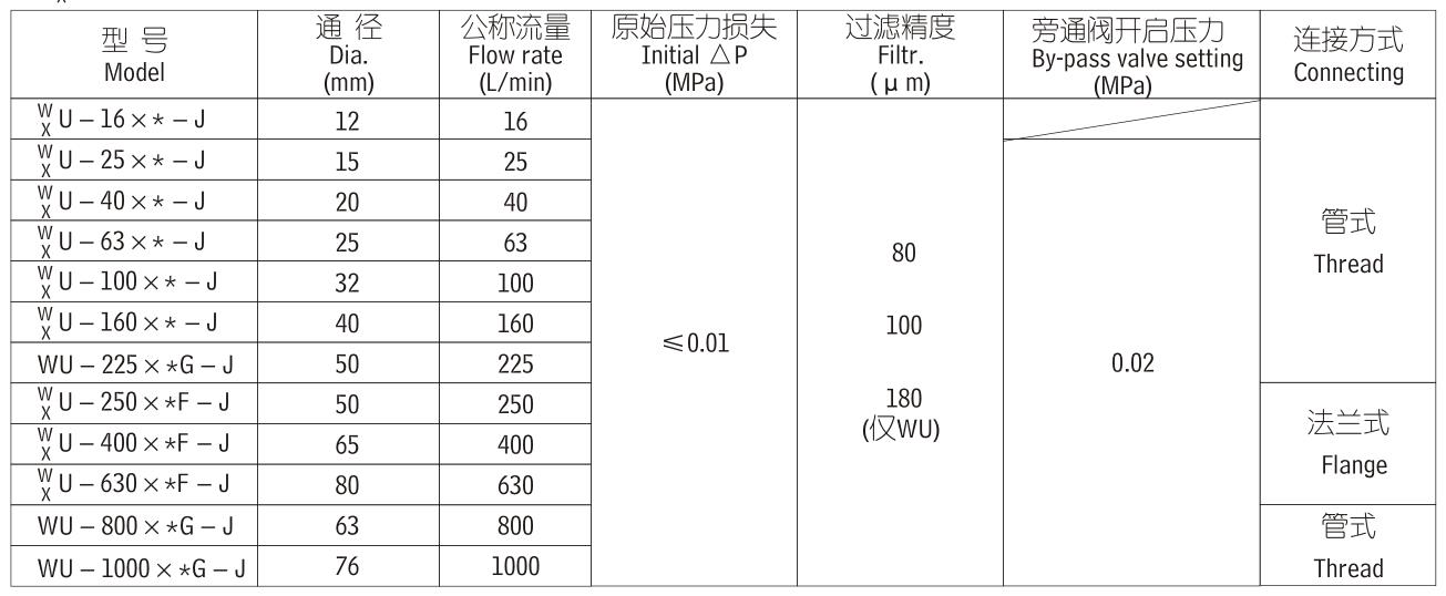 注:*為過濾精度 如流量63L/min、精度100微米,則型號為XU-63*100-J